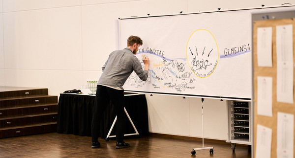 Zusätzlich zu den Eckpunkten des Papiers „Ganztägige Bildung und Betreuung in Baden-Württemberg - Leitbild und Gelingensfaktoren“ wurden Aspekte des Vortrags von Herrn Prof. Dr. Markus Sauerwein von der TU Dortmund sowie Blitzlichter aus den Fachforen im Rahmen des Graphic Recording aufgenommen:
