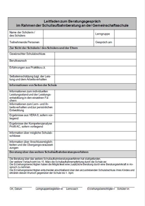 Dieser Vordruck dient als Leitfaden zum Beratungsgespräch im Rahmen der Schullaufbahnberatung an der Gemeinschaftsschule.